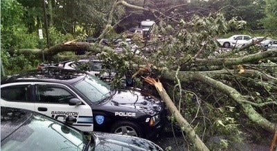 Photos from the Barrington Fire Department show downed trees laying across cars in the parking lot, smashing through windows and roofs.