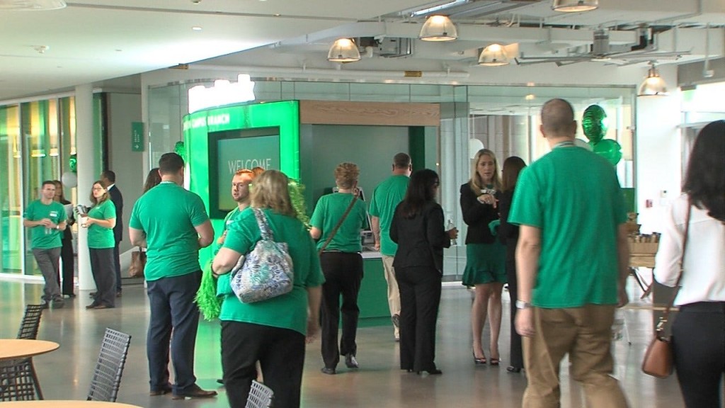 Employees decked out in green celebrated their nearly 500,000 square foot workplace, including a cafeteria, wellness center, and…’CB2’, the robot that patrols campus, feeding video directly to corporate security.