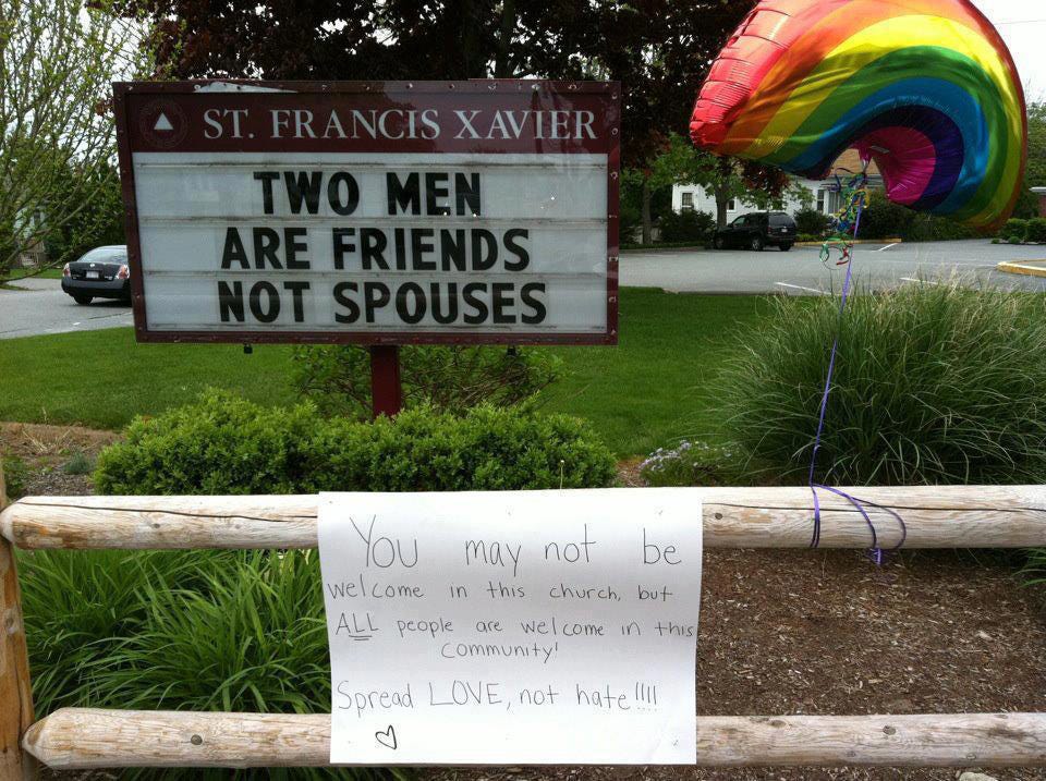The church has received hate e- mails and threats over it.Protestors were out in front of the Saint Francis Xavier church in Acushnet , they're disturbed by a sign that was posted by the church..that reads”Two men are friends not spouses.”