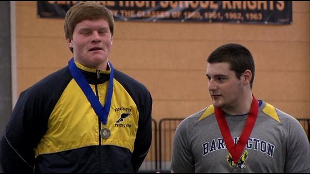 Barrington’s Adam Kelly and teammate Bobby Colantonio not only finished first and second in the state indoor track meet, they are first and second in the country in the weight throw.