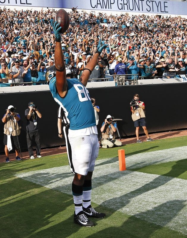Bortles connected with Donte Moncrief, Keelan Cole and Austin Seferian-Jenkins for scores in the first 30 minutes, the second time he’s done that in his NFL career. Bortles completed 29 of 45 passes for 377 yards, with the four TDs and an interception. It was the best game of his five-year career.