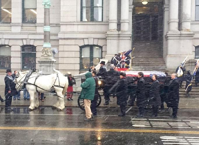 His coffin taken by horse-drawn carriage from City Hall to the Cathedral of Saints Peter and Paul, where a detailed service was officiated by Providence Bishop Thomas Tobin.