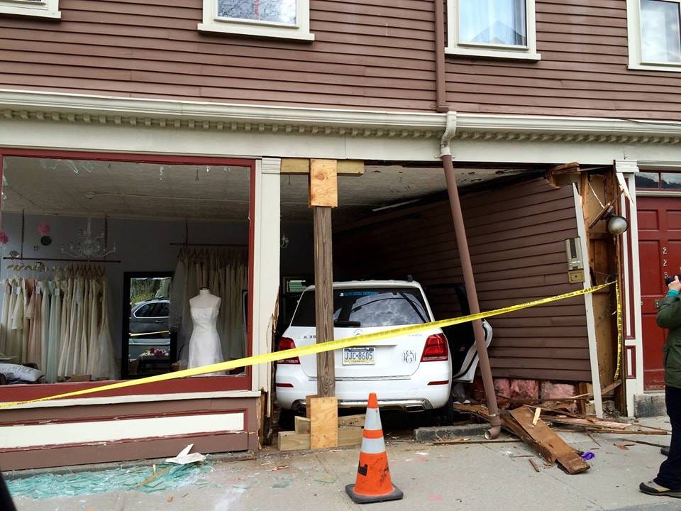 The three story building at 225 Spring Street, which houses a mix of retail and residential space, has significant structural damage. All the dresses were safely removed.
