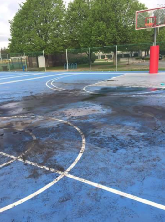 The car left significant marks and burns to the basketball court that was renovated less than a year ago by several volunteers, including local artist and community activist, John Carnevale.