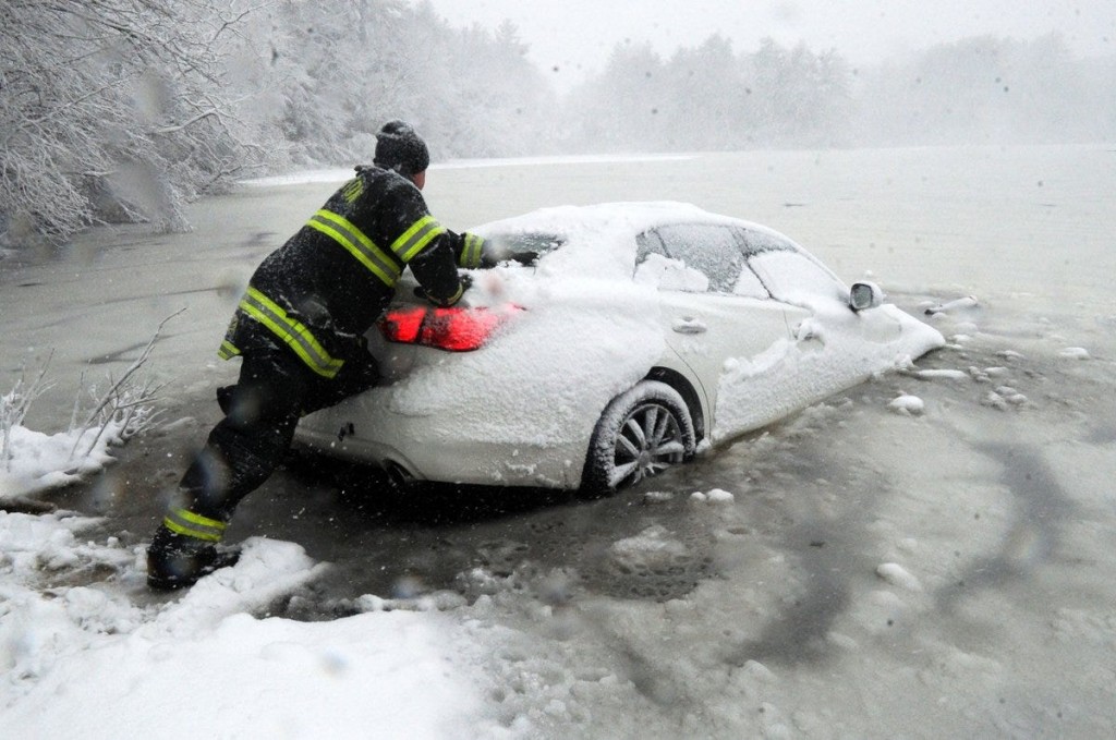The white Infiniti slid off West Street and into Ames pond around noon during the winter storm.