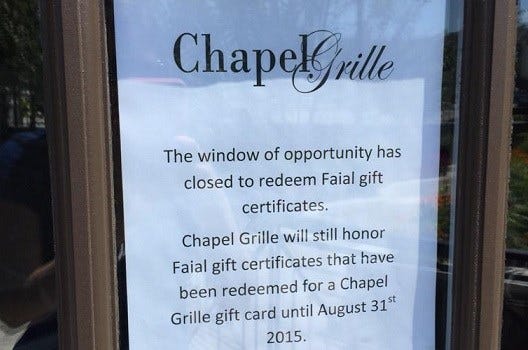 Chapel Grille in Cranston is no longer honoring gift certificates from the now closed Faial Restaurants.