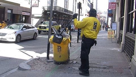Crew members known as “yellow jackets” are spending hours each day sweeping up 81 square blocks near downtown properties.