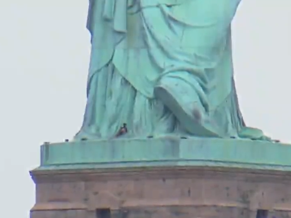 Climber on the base of the Statue of Liberty after anti-ICE banner hung