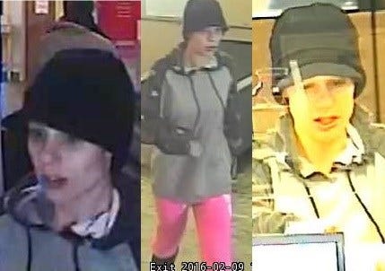 The suspect, whose image was caught on security camera, is described as a five foot tall white female with a thin build. She was wearing a black knit cap with a brim, a waist length blue and grey coat that had stars on the sleeves, pink pants, and black boots.