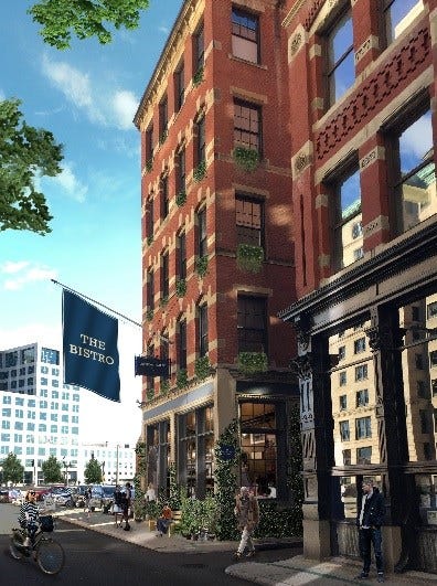Designers plan to keep the building’s original façade, grand glass storefront, rope molding and bronze casements and include a street-facing restaurant with separate lobby for the apartments.