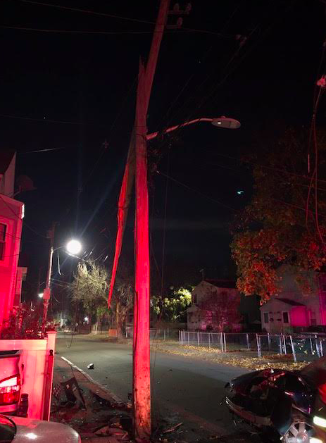 The impact of the crash caused the pole to snap in half. National Grid was on scene and made repairs.
