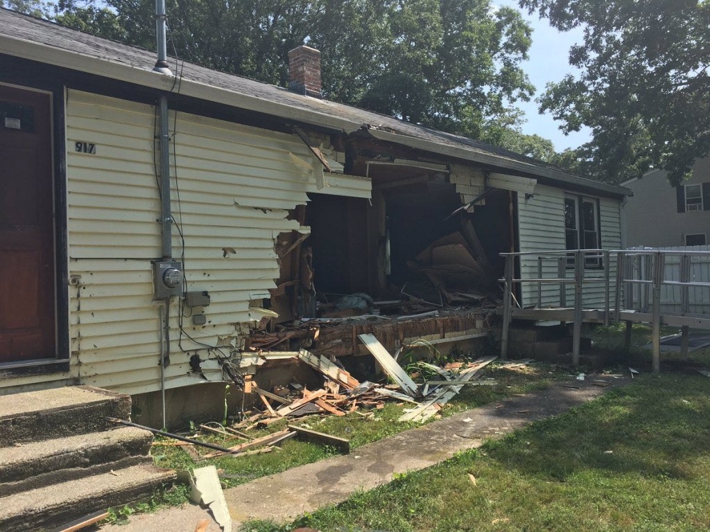 Pieces of siding, wood and glass litter the ground, a gaping hole left in 917 Broad Rock Road. Neighbors woken up late Friday night by all the commotion.