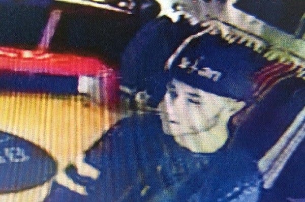 The first suspect is described as a white male about 5’9” in height with a thin build. He was seen in the store’s surveillance video wearing a black jacket with white rings on the sleeves and a black hat with the word “satan” on it.