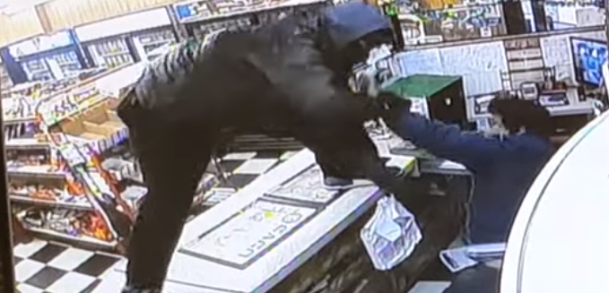 The robber was masked with only his eyes showing. In the video he can be seen quickly jumping the counter and going after the owner of the store with a knife.