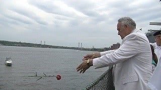 The ceremony at Battleship Cove included a 21 gun salute, the releasing of doves and the dropping of flowers into the Taunton River.