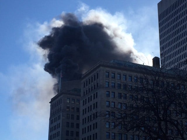 The view of downtown Providence was obstructed by black smoke pouring from the roof of the Textron building around 10:30 Sunday morning.