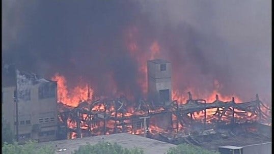 State Fire Marshal Stephen Coan says the fire at the Anglo Fabrics Mill in Webster began in one building Thursday and spread to a second structure. Smoke from the five-alarm fire could be seen from miles away.