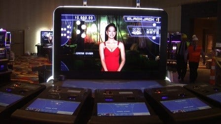 “Blackjack anyone?” asks an attractive female virtual host on a large screen.