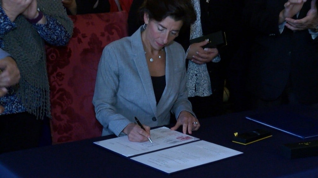 Raimondo ceremoniously signed legislation Friday that will extend veterans’ benefits to gay or transgender veterans who were not honorably discharged.