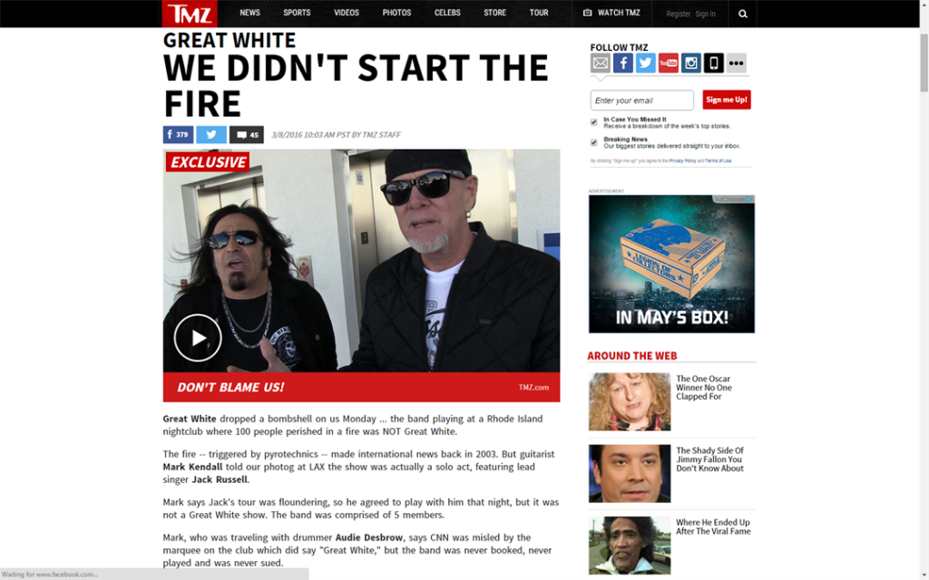 A TMZ video interview headlined: We Didn’t Start the Fire, shows guitarist Mark Kendall and drummer Audie Desbrow saying their band, Great White, was not playing at the Rhode Island nightclub where pyrotechnics sparked a fire that took the lives of a hundred people.