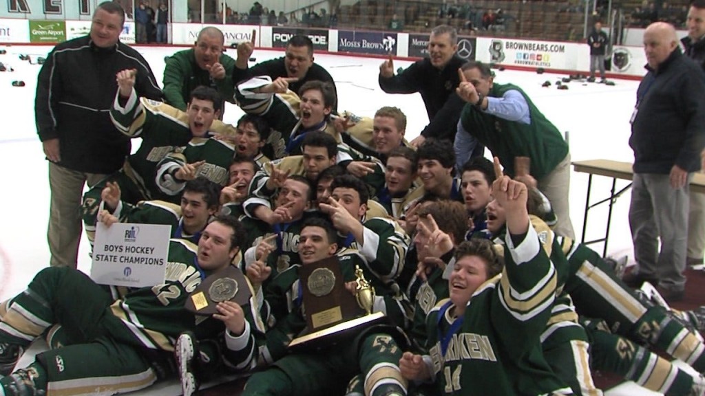 The Hendricken Hawks swept their way to the Championship Division title with a 3 to 1 win over hard playing LaSalle. The Hawks beat the Rams in OT in game one, and then nailed down back-to-back state titles with a win on Saturday night at Meehan Auditorium. Patrick Creamer was named the MVP.