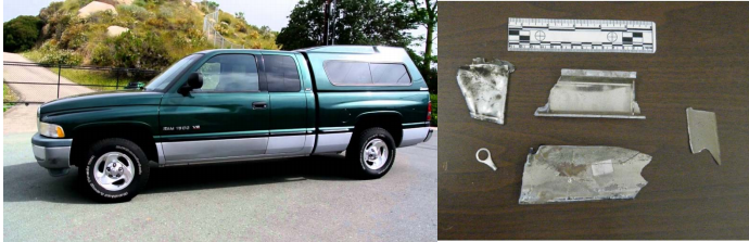The debris seen in the above picture was recovered from the scene of the hit and run, and confirms the make and model of the suspects car model.