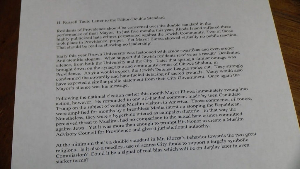 "We had three anti-Semitic attacks and yet Mayor Jorge Elorza doesn’t want to do anything about that. So that’s why I wrote the letter. A double standard,” said Taub.