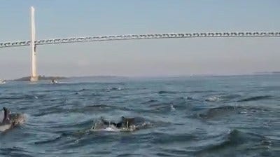 A large pod of dolphins was spotted in Narragansett Bay on Monday.
