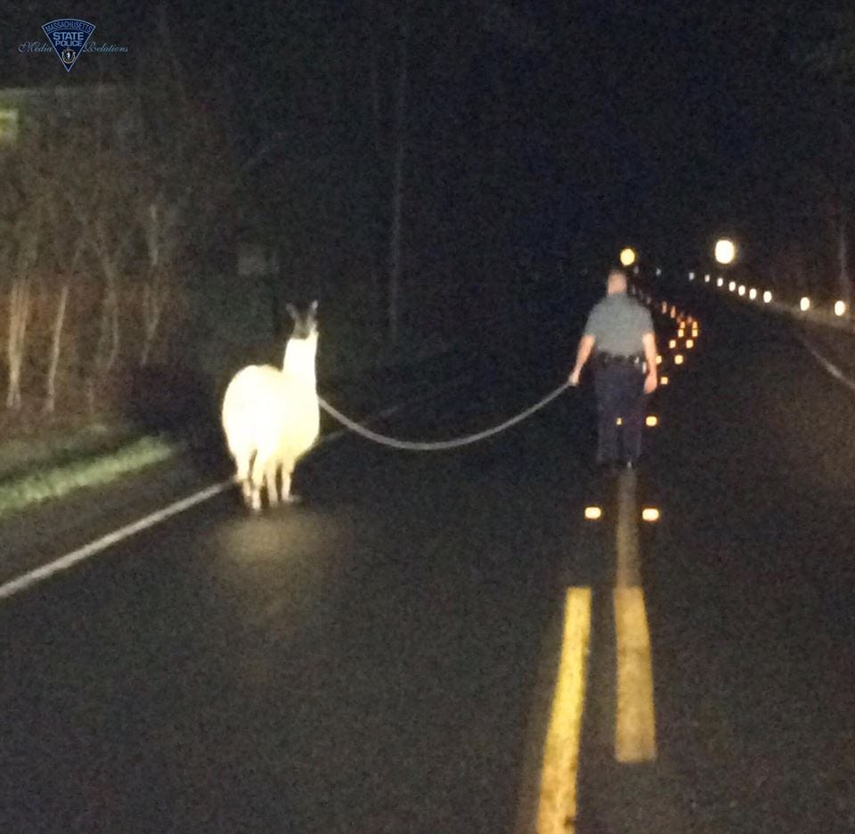 RUSSELL, Mass. – Massachusetts State Police are praising the cowboy skills of one their troopers after he lassoed a llama that was loose on a state highway and led it to safety.