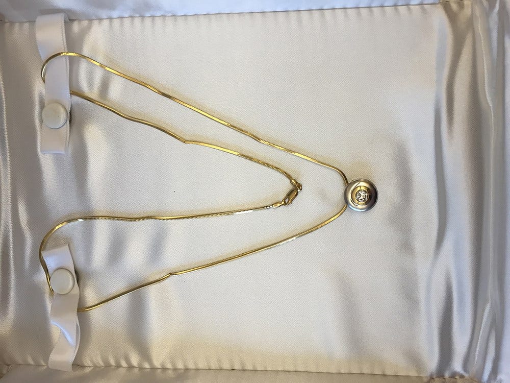 Sorting through donations last week, volunteers found a half carrot diamond pendant on a gold chain.
