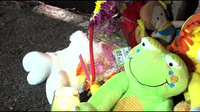 Candles, stuffed animals and a note reading “Rest In Peace Little Girl” are placed around a utility pole on Smith Street.