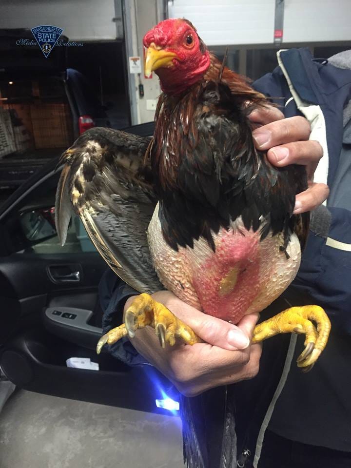 STURBRIDGE, MASS. — Three roosters were rescued from a cock fighting ring during a traffic stop in Massachusetts Sunday.
