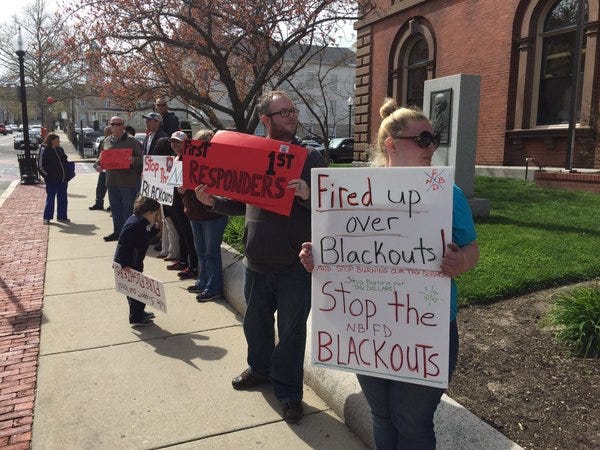 New Bedford residents protested on the steps of city hall Thursday afternoon in an effort to stop the city’s rolling blackouts of their fire companies.