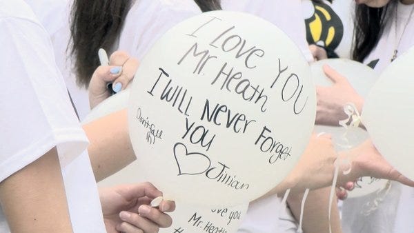 The students wrote messages to their beloved Mr. Heath on balloons and then released. They all wore shirts designed by a student that combine Heath’s name and his love for Batman.