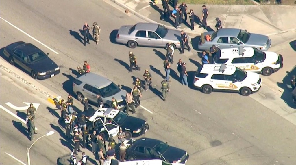 San Bernardino Police Chief Jarrod Burguan says on Twitter that investigators believe “the suspect is down.”