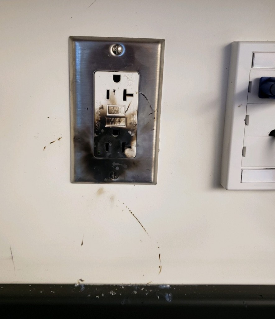 In the back of the room, they were shown a blackened electrical outlet.
