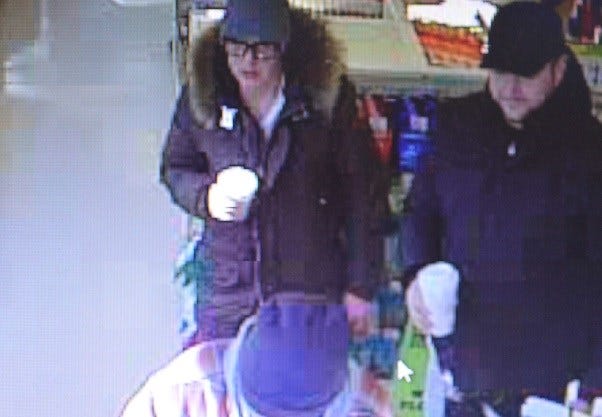 The second suspect is a thin, white female, mid to late twenties. On surveillance she is seen wearing a knit cap, thick-framed eyeglasses, has a winter coat with a fur-lined hood, gray sweatpants, and white sneakers.