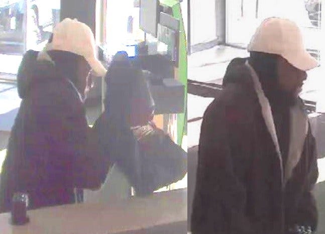 The suspect is described as a black male, between 40-50 years old, with a dark colored beard or goatee, roughly between 5”9-5’11” tall, wearing a black zip up hooded sweatshirt with white fur lining, a black, open faced mask (balaclava) that concealed his hair and neck, white sneakers, and a plain white baseball hat with no logo on it.