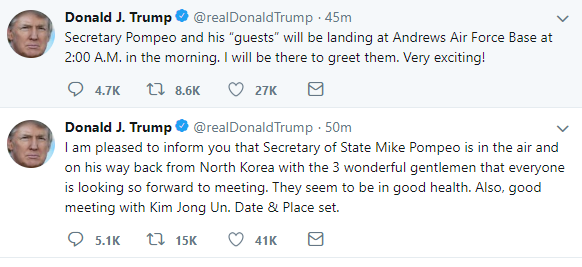 Trump made the announcement on Twitter Wednesday, saying “Secretary of State Mike Pompeo is in the air and on his way back from North Korea with the 3 wonderful gentlemen that everyone is looking so forward to meeting.”