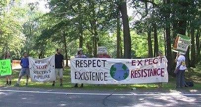 Just feet from the entrance of Spectra's Fracked Gas Compressor station, a group holds signs stating their disagreement with an expansion.