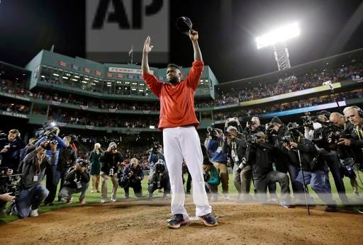 After walking on four pitches — the final plate appearance of his career — Ortiz stood on first and waved his arms at the mostly dormant crowd of at 39,530. The fans rose to cheer for him and stayed there as Hanley Ramirez singled to make it 4-3.
