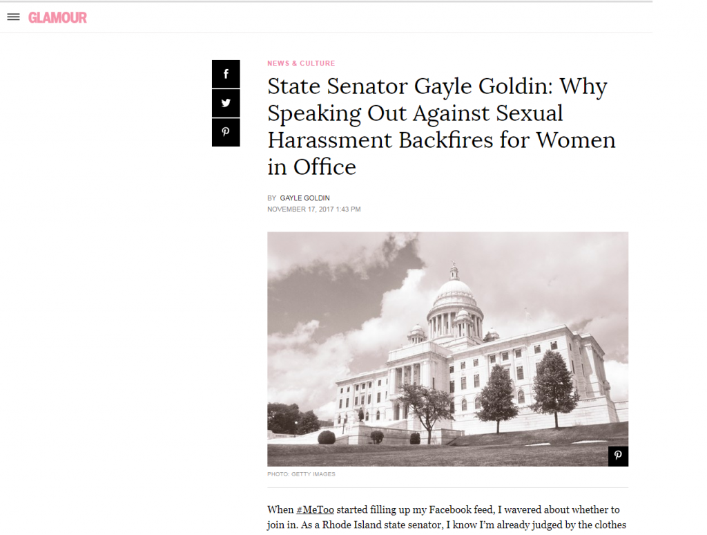 State Senator Gayle Goldin is speaking out about sexual harassment and sexism in the Rhode Island State House in a new online article for Glamour Magazine.