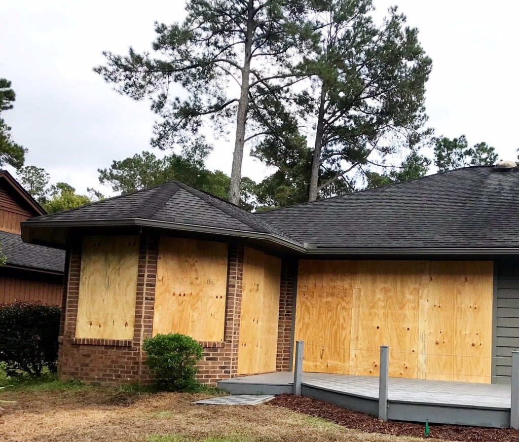 The lake in his backyard has been drained ahead of the storm surge and torrential downpours. His windows and doors are boarded up.