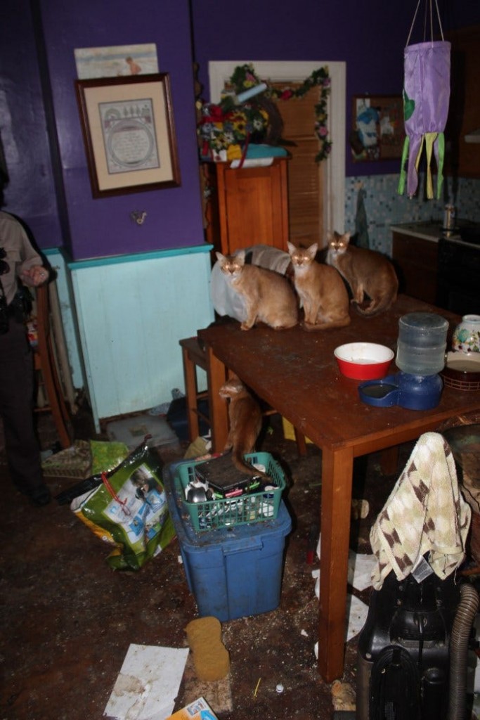 The RISPCA found the cats while executing a search warrant at 103 Kay Street in Newport, Rhode Island. The search resulted in the discovery of 18 cats living in deplorable conditions, as well as the remains of 26 cats in a freezer.