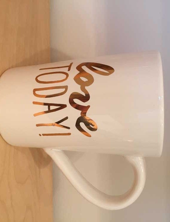 The mugs are 14 ounce white ceramic cups with "Love Today" printed in gold metallic on the front.