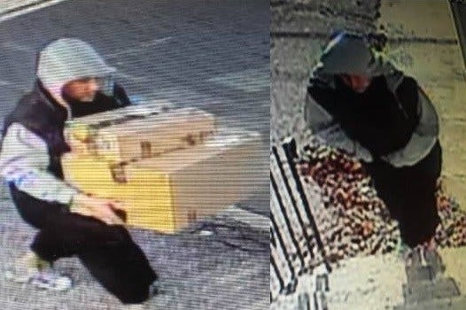 Surveillance cameras at the residence on John Street captured the suspect snatching two boxes from the front steps at approximately 10:41 a.m. on Monday. The suspect is seen wearing a grey hooded sweatshirt, black vest, and black pants, with sneakers.