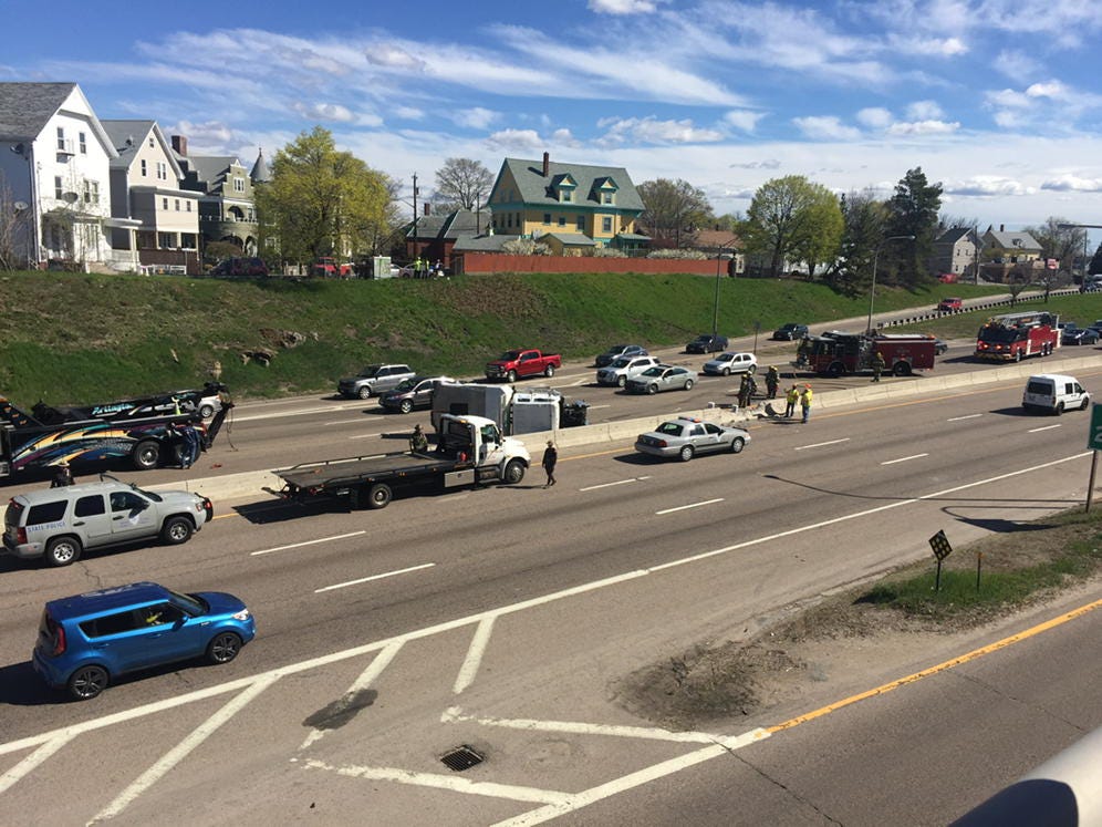It happened just before 9 a.m. when a tractor-trailer truck hopped the cement barrier between exits 27 and 28.