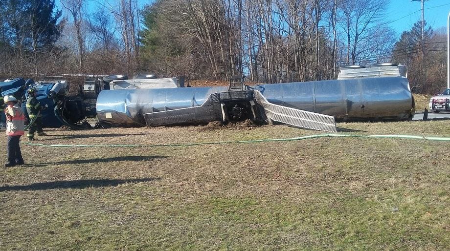 State Police say the truck was carrying "yellow grease" which is used to create biodiesel fuel. The Department of Environmental Management was on scene to help with the cleanup.