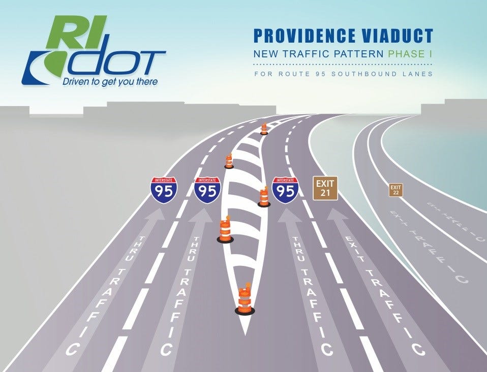 • Phase 1: Scheduled to be in place Saturday, October 22, there will be two through lanes to the left on the old bridge and one through lane to the right on the new bridge. Traffic taking Exit 21 can use the far right lane (which is an exit-only lane for Atwells Avenue).