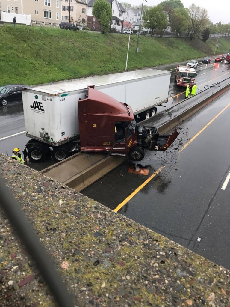 According to Rhode Island State Police, a tractor-trailer crashed into the median between I-195 East and West around 11:30 a.m.
